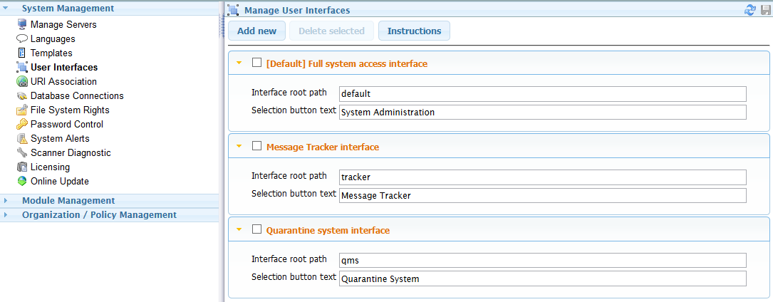 The Interface root path changes which section (default for system administration, tracker for message tracker and QMS for quarantine management system) of GWAVA the button logs the user into.