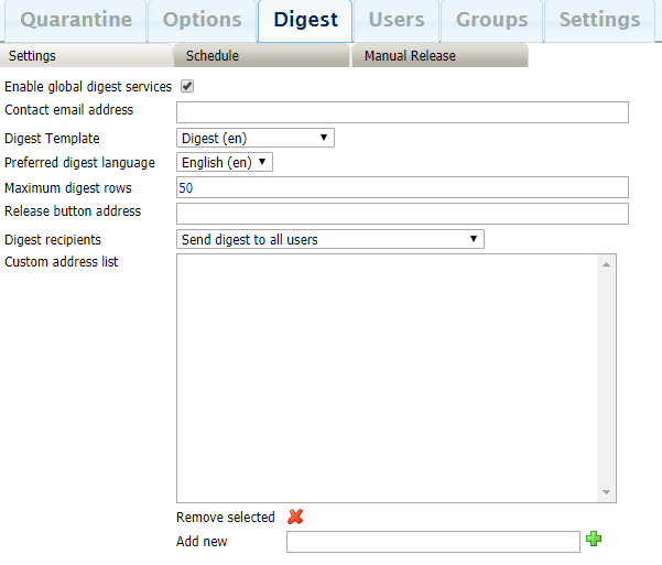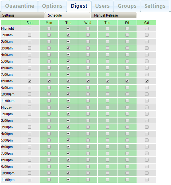 Under the Schedule sub tab select a day or time for the digests to be sent to users when the user has one or more quarantined messages. Quarantined messages will be removed after 30 days by default. Click on the Time row to select the entire row, click on the Day column to select an entire day, or the top corner for all.