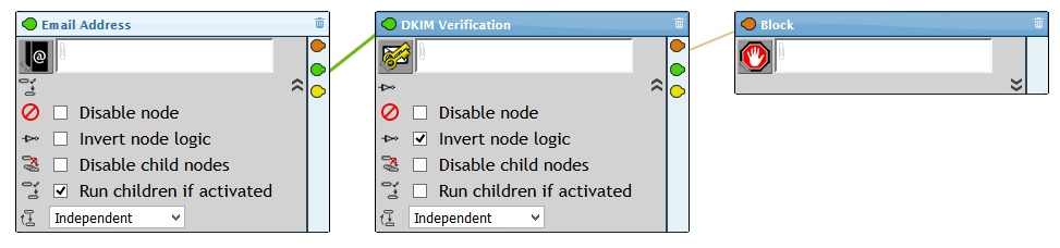 If you know that a sending domain applies DKIM signatures to all of their outboundemail, you can define a rule chain to protect against spoofed email attempts of that domain. This setup will start with an email address filter connected to a child DKIM filter, followed by a block service connected to the DKIM filter.