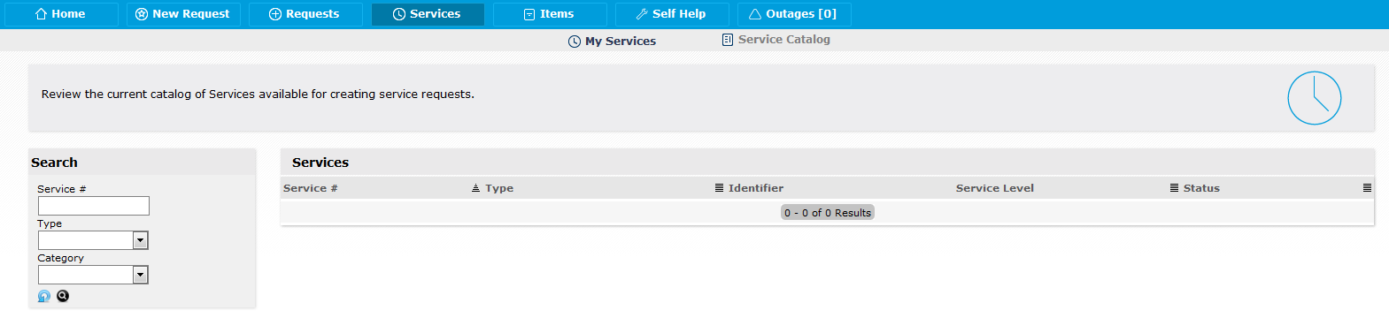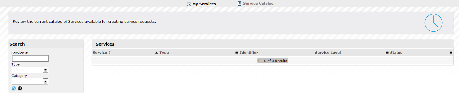 My Services: The view in the Customer Portal displays services that are assigned to the Customer or the Organizational Unit to which services are assigned.