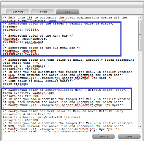 The CSS tab allows Users to customize the look and feel of banner backgrounds and tabs within the system. Knowledge of working with cascading style sheets is recommended when making changes to these settings.