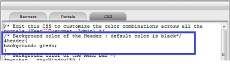 This example shows how to change the default header color to green. In the #header section for background, you can either directly specify green or use the Hex color code for green. After saving the changes, you can see a change in the background color of all portals as shown below: