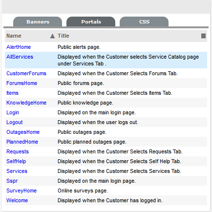 Displayed on public portals for Knowledge, Outages, Surveys and Forums. This banner is also included in emails when the Setup>Email>Setup option of Include Banner is set to Yes. |