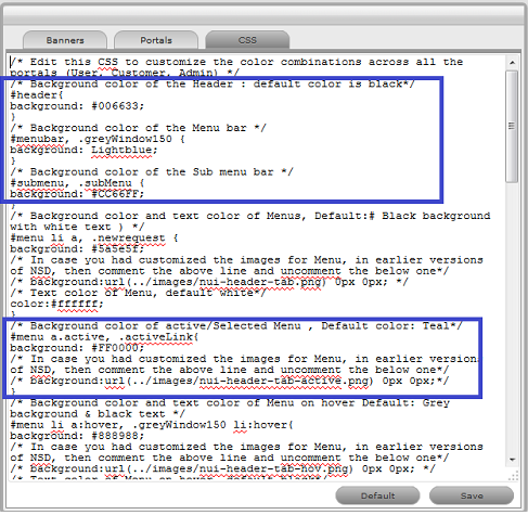 The CSS tab allows Users to customize the look and feel of banner backgrounds and tabs within the system. Knowledge of working with cascading style sheets is recommended when making changes to these settings.