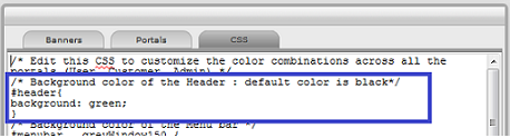 This example shows how to change the default header color to green. In the #header section for background, you can either directly specify green or use the Hex color code for green. After saving the changes, you can see a change in the background color of all portals as shown below: