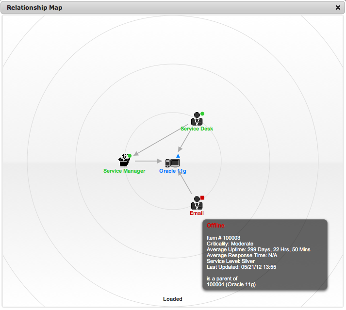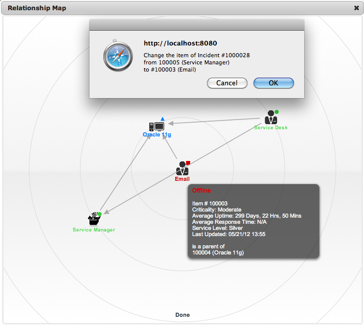 opens a pop-up window that displays a map of Items that are related to the Request Item that can be navigated by clicking on the icons within the map. To view related Item information, scroll over the relevant Item icon.