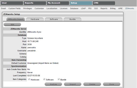 Navigate to ZENworks Import tab and click Import to start importing the selected items from ZENworks into the CMDB.