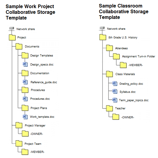 In the project collaborative storage template, all members can see the contents of each member’s folder—except for the designated manager’s folder. In the classroom template, class members cannot see the contents of other classmate’s folders because members have rights only to their personal folders.