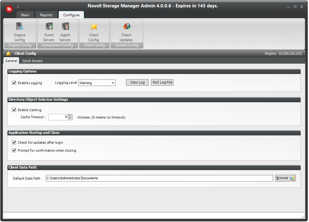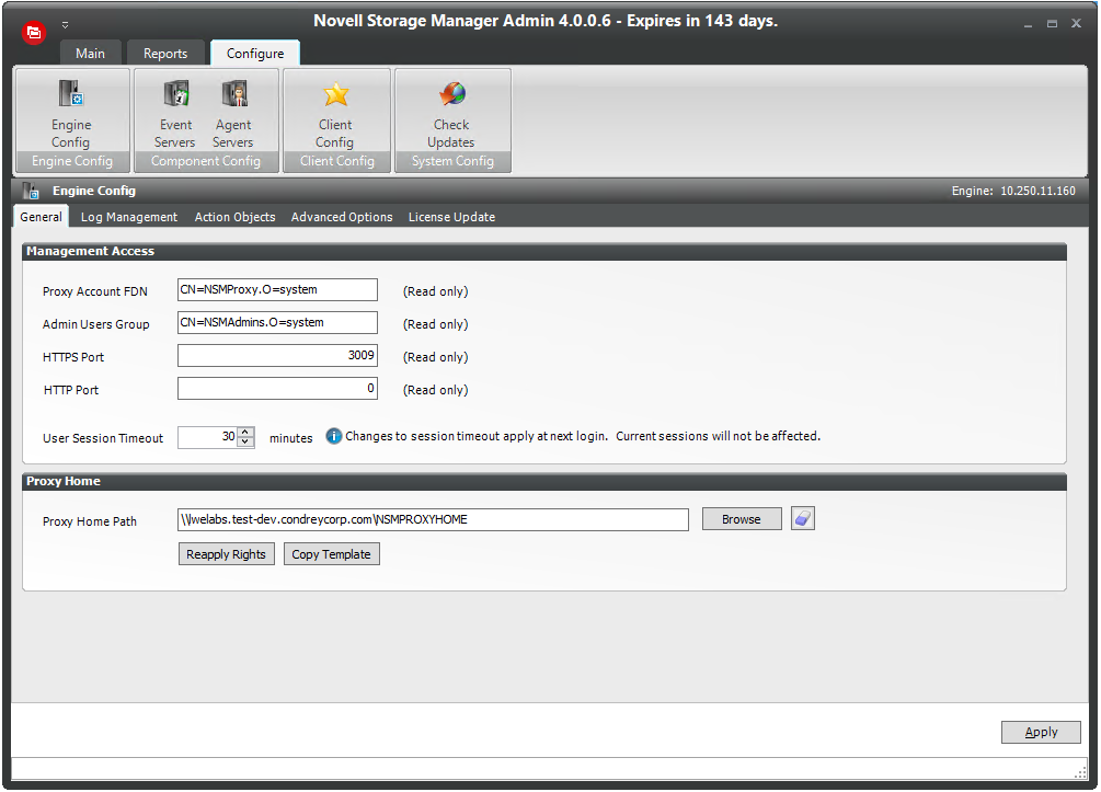 At the server that is hosting the NSM Engine, go to C:\ProgramData\Novell Storage Manager\Engine\config.