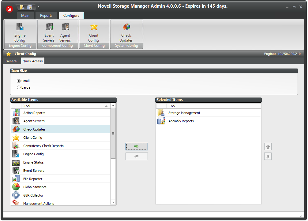 This page lets you access the items you use most in NSMAdmin from the Quick Access Toolbar. Items can be added or removed from the Quick Access Toolbar by right-clicking the item from its location in the interface, or through the Quick Access page shown below.