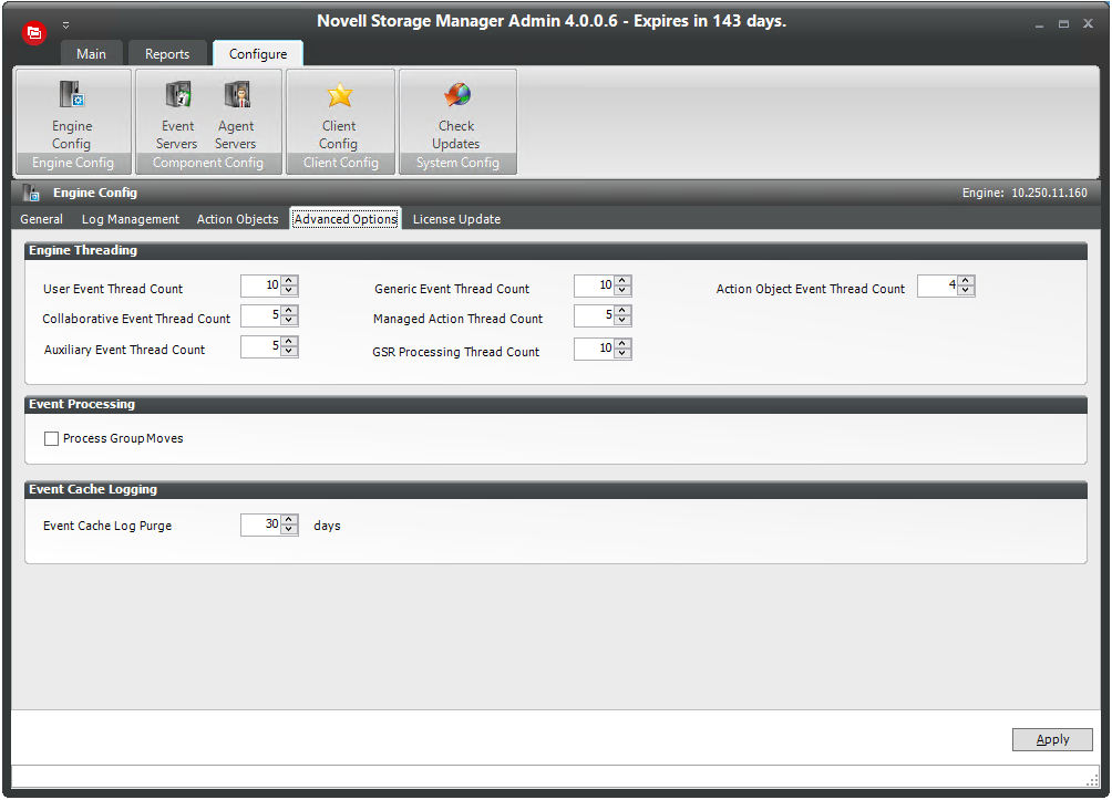 Event Cache Log Purge: By default, Novell Storage Manager keeps the most recent 30 days of event entries in cache. You can adjust the setting in the field.