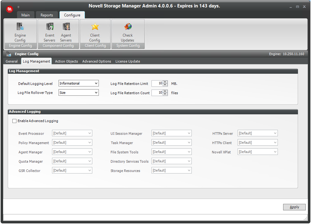 Log File Retention Count: By default, Novell Storage Manager retains the 10 most recent log files, according to the Log File Rollover Type setting. For example, if the setting is set to , the retained log files are from the last 10 days.
