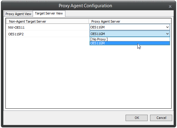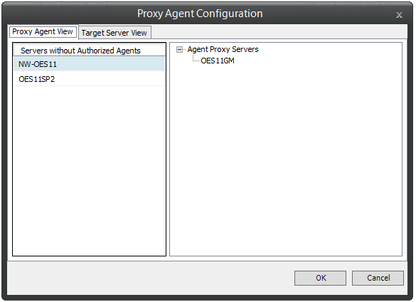 The left side of the Proxy Agent Configuration dialog box shows the list of servers without NSM Agents installed. The right side shows the servers with NSM Agents installed. In the example below, the NSM Agent on OES11GM could be set up to be the Proxy Agent for the NW-OES11 and OES11SP2 servers.