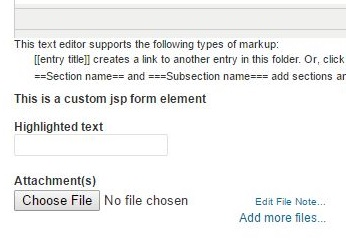 NOTE:It is possible to replace the entire, standard OpenText Vibe form and to replicate coding for the Vibe tools (attachments, subscribing to the entry, and sending mail upon entry creation) using code in your JSP. However, doing so is significantly more difficult to code. The example in this section documents the best practice of using JSPs to generate most of the form while still enabling the Vibe tools for standard entries.
