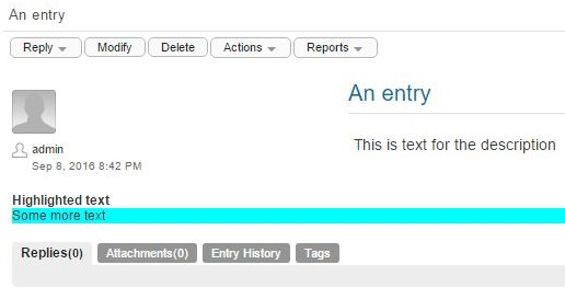 Assuming that the user entered Here is some text in the Highlighted text box, then submitting the form results in the user seeing this in the completed entry: