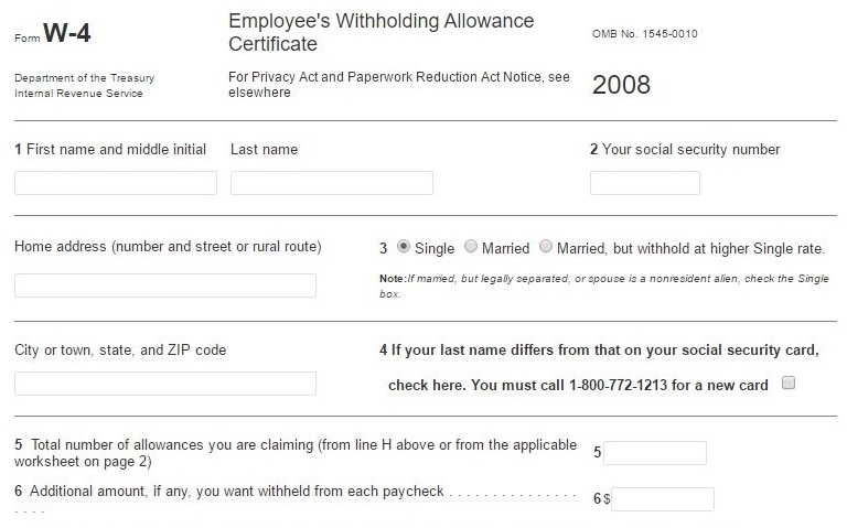 <%@ include file="/WEB-INF/jsp/definition_elements/init.jsp" %> <table width="100%" cellpadding="6" cellspacing="0" summary="W4 form"> <tr> <td><font size="-2">Form</font> <b><font size="+2">W-4</font></b></td> <td colspan="5"><font size="+1">Employee's Withholding Allowance Certificate</font></td> <td><font size="-2">OMB No. 1545-0010</font></td> </tr>