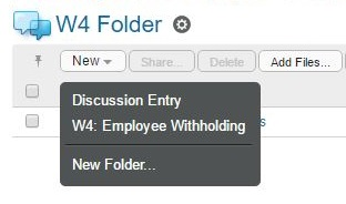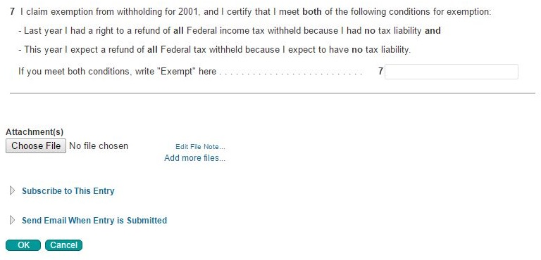 This section describes custom JSPs that implement a W-4-form application. (A W-4 form is a government form in the U.S.A. that is used to withhold federal taxes from an employee’s pay.) This application requires that the entry resemble the paper form, but it allows for the use of standard tools within Vibe. This application allows users to add comments to the W-4 entry, to subscribe to the entry, to send e-mail upon creation of the entry, and to apply a workflow process to the entry. Finally, the application changes the styles of the buttons used to cancel or submit the form.