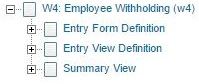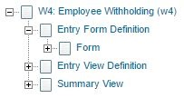 To report custom elements, access the definition of the custom entry (W4: Employee Withholding (w4)), and open the form definition by clicking the plus sign (+) next to both Entry form definition and Form. Then, click Custom JSP - W4 Federal Form. Finally, add elements as children to Custom JSP - W4 Federal Form.