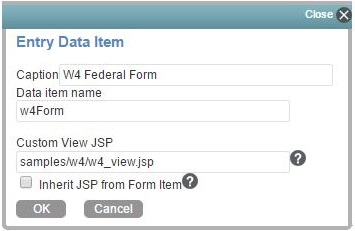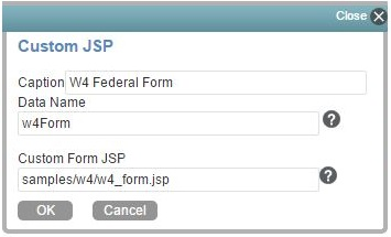 NOTE:Be sure to add the path to the filenames specified in the previous graphic. For example, the correct path for the form customization is samples/w4/w4_form.jsp.