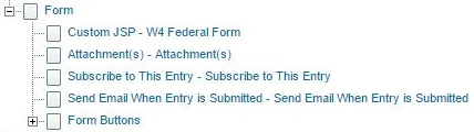 For the W-4 application, the standard title and buttons are not needed (the custom JSPs provide these elements). So, use the entry designer to delete the Title - Title and Form buttons elements from the form definition. Next, add the Subscribe to this entry and Send mail when entry is submitted elements. This is the appearance of the form definition when you are finished: