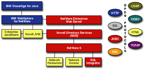 Novell's implementation of the Open Application Server (OSA) model defined in IBM WebSphere for NetWare marks another chapter in the complementary relationship between Novell and IBM. These open standards include HTTP, HTML, and XML for interacting with Java clients; ODBC and JDBC for accessing remote databases; and TCP/IP as the underlying network transfer protocol.