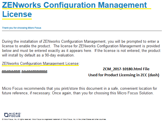 In this Text file (.txt or .html), a License key for the ZENworks Suite is provided.
