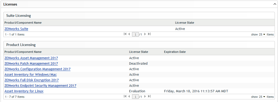 All ZENworks Configuration Management components are available when the ZCM is installed. Licensing enables the components or products to be Active by providing a license key or to evaluate products for which you have not purchased a license. The License can be deactivated if that product is no longer intended to be used.