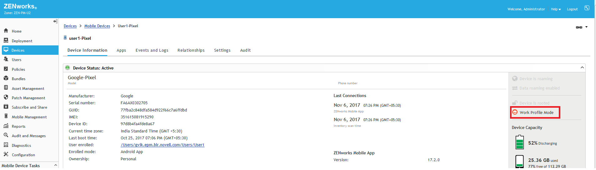 7. The device information can now be viewed in ZCC. Click Devices > Mobile Devices (or navigate to the folder as configured in the Mobile Enrollment Policy) from the left hand navigation pane in ZCC. Click the appropriate device and view its details in the Summary page. The enrollment mode is displayed as Android App and Work Profile Mode is also enabled.