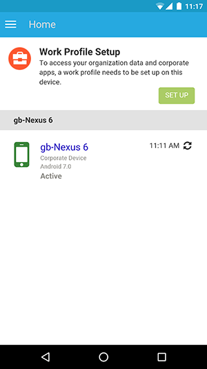 The user clicks Set Up and follows the prompts to set up the work profile. The device will automatically set up the work profile. You can view Work Profile Mode enabled in the device’s information page in ZCC (Devices > Mobile Devices ><Click the device> > Summary).