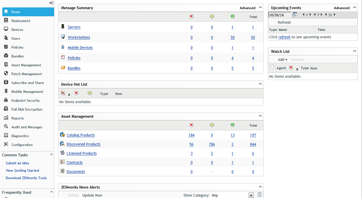 The Asset Management panel on the Home page lists the total number of properly licensed products (), underlicensed products (), and overlicensed products (). You can click a status to view the licensed products with that status.