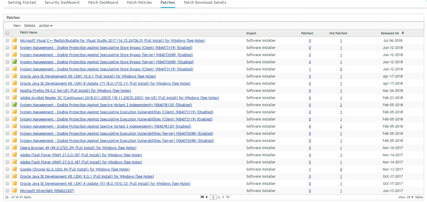 Software Installers: These types of patches are software applications. Typically, this includes software installers. The patches show Not Patched if the application has not been installed on a machine.