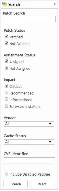 The Search panel on the Patches page offers extensive search and data filtering options that allow you to search for specific patches and filter result sets based on the patch status, impact of the patches and assignment status. Searching and filtering can be performed independently of each other or can be combined to provide extensive drill-down capabilities.