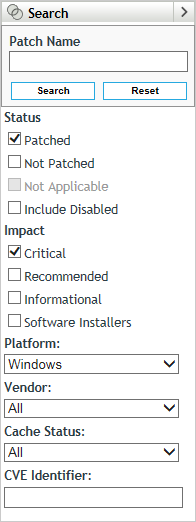 The Search panel on the Patches page offers extensive search and data filtering options that allow you to search for specific patches and filter result sets based on the status and impact of the patches. Searching and filtering can be performed independently of each other or can be combined to provide extensive drill-down capabilities.