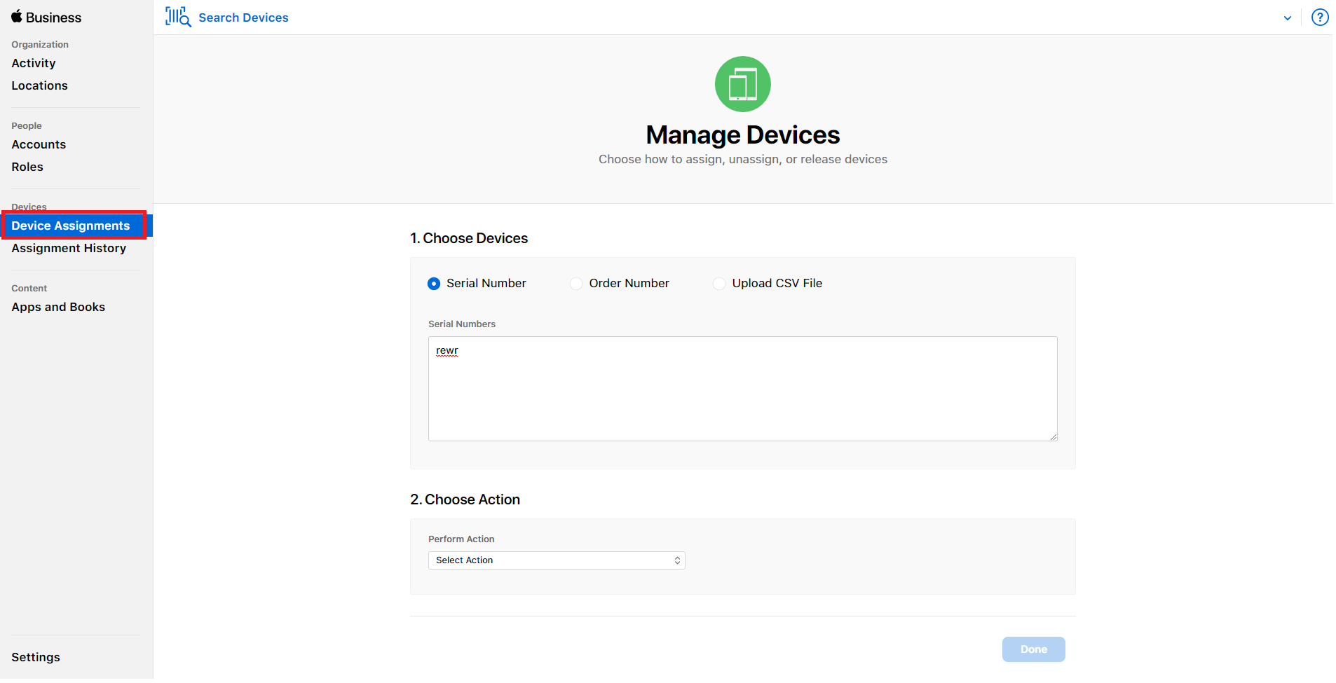 • Upload CSV File: Upload a comma-separated value (CSV) file that contains a list of device serial numbers.