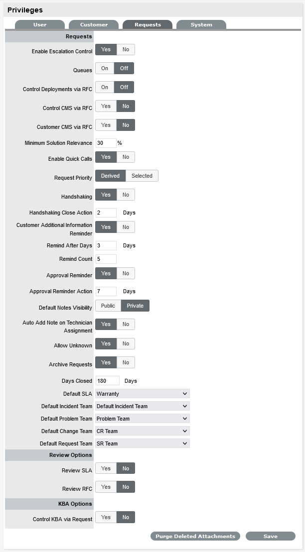 The Privileges tab contains global setup options that govern the application behavior, how Customers and Users can interact with the system and define system defaults.