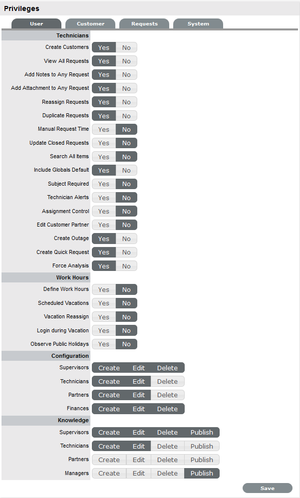 Within the User tab, privileges for Users with the Technician and Partner Role can be configured by customizing the options within the Technicians options list. This also includes enabling functionality related to all User work hours and public holidays. Defaults can also be adjusted for Users across the Knowledge Management and Configuration Management processes.