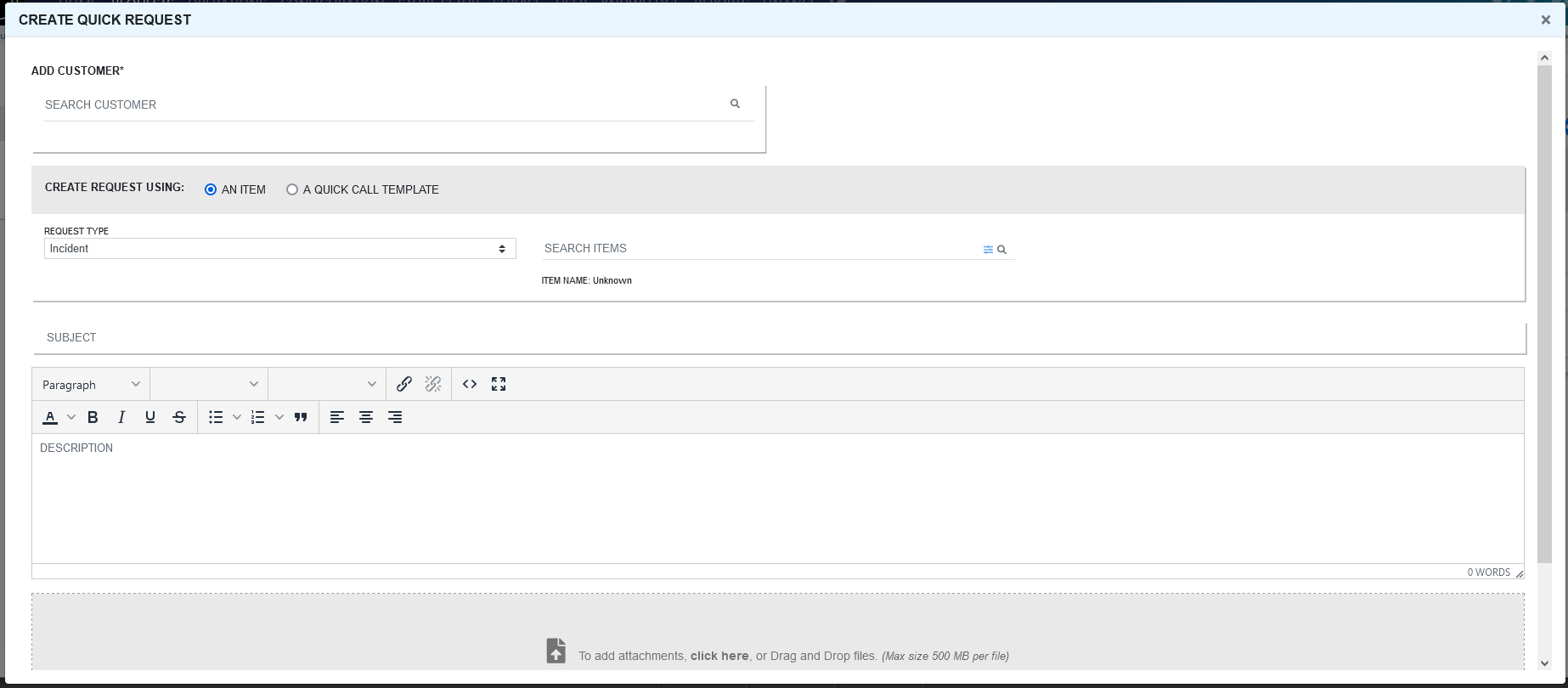 Create Request Using: You can create a request either using an Item or a Quick Call Template.