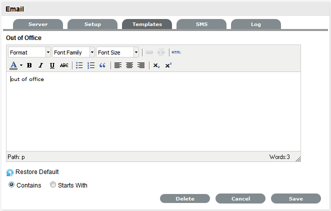 Users can customize multiple Out of Office options within the application, which allows the system to identify incoming email Subject lines with this message in different languages. The system will ignore emails with this content in the Subject line of emails.