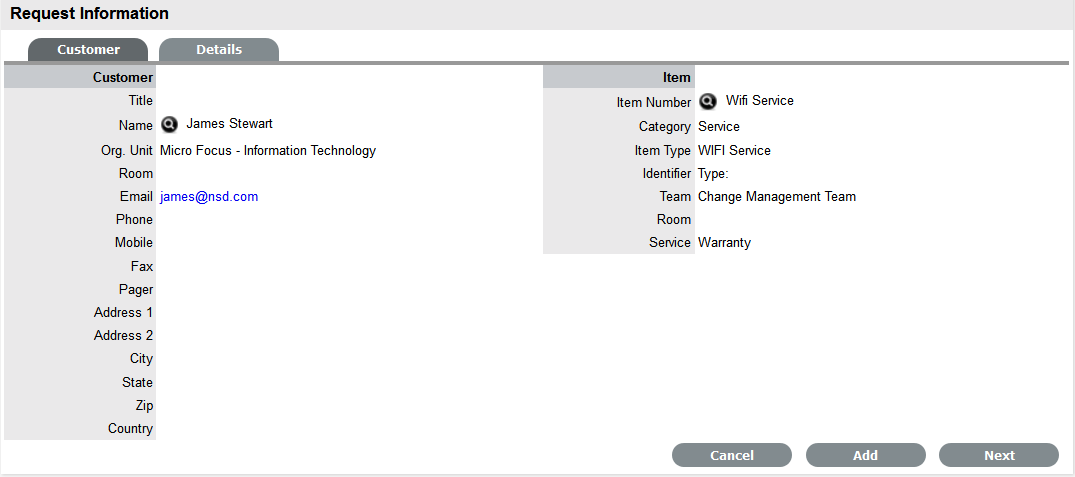 Displays the Customer assigned to the Incident and their contact information. Click on the Customer Name or Org.Unit link for more details relating to Customer and Org Unit. To update the Customer details assigned to the request, click on the Customer tab and ensure the Request is in edit mode. |