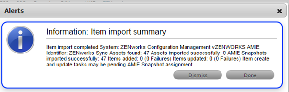 the number of AMIE Snapshots successfully imported, with a breakdown of new Items added and number of Items updated.
