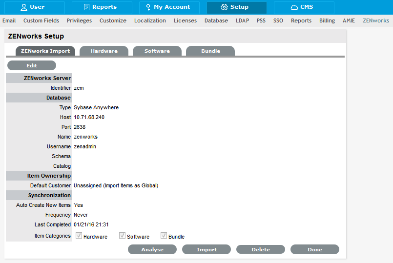 Navigate to ZENworks Import tab and click Import to start importing the selected items from ZENworks into the CMDB.
