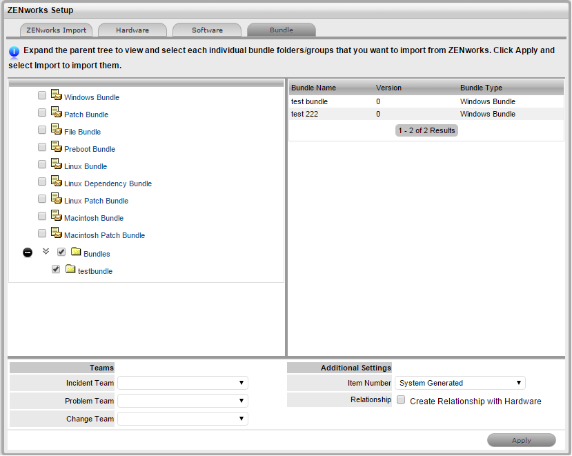 Review the information, and select each individual device folders, groups, software type, and Bundles that you want to import from ZENworks.