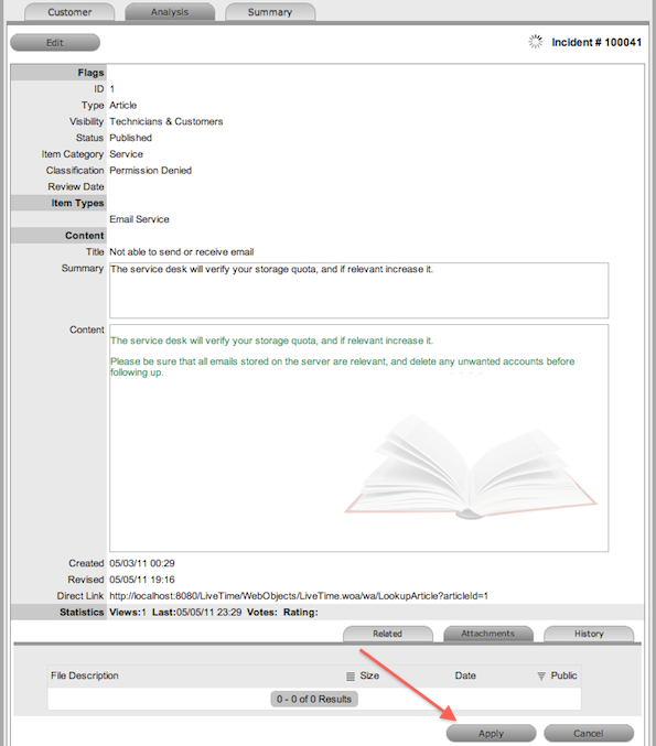 If a proposed solution is appropriate, select the Article number and click the Apply button