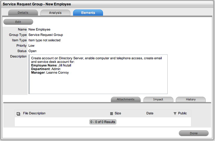 When Service Requests are raised for Service Item breakdowns, the system allows them to be easily associated with an Incident within the Analysis tab of the Request. Or, if the Service Request results in a change to an Item that is not in the Service Catalog, a Change Request can easily be generated within the Service Request.
