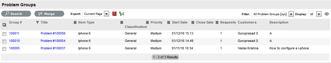 Existing Problem Groups can be merged within the All Known Error or All Problem Groups filter view of the Errors screen, to allow all related requests within the Groups to be managed as one. To combine Problem Groups: