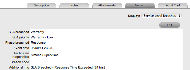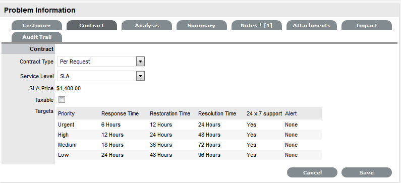 Alternatively, the Workflow State can be configured for the Technician assigned at the time the Problem is moved to the Underpinning Contract State to maintain Problem editing privileges and manage adherence to the assigned service agreement. If the Workflow is configured for the responsibility of the Problem to be maintained by the Technician when the Problem is in an external contract state the Technician will be able to adjust the current Status, add Notes and, if the Technician is assigned the Internal Process of Service Level Management, amend the Contract Monitor information in the Impact tab.