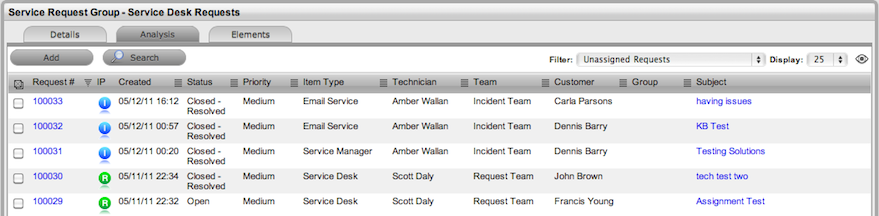 Requests can be linked to a Group within the Analysis screen of a Problem Group. To search for requests to add to the Group, use the system filters or the Search option.