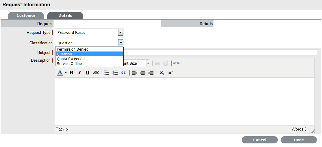 A Service Request is a generic term that describes the numerous and varied demands placed on the service and support organization. Many are small changes, which are considered to be low risk, frequently occurring and low cost in nature, such as change a password or install a software application request. Alternatively, it may simply be a Customer asking for information. It is the scale, frequency and low-risk nature of the Service Requests that require that they be handled by the Request Fulfilment process, and not Incident or Change Management.