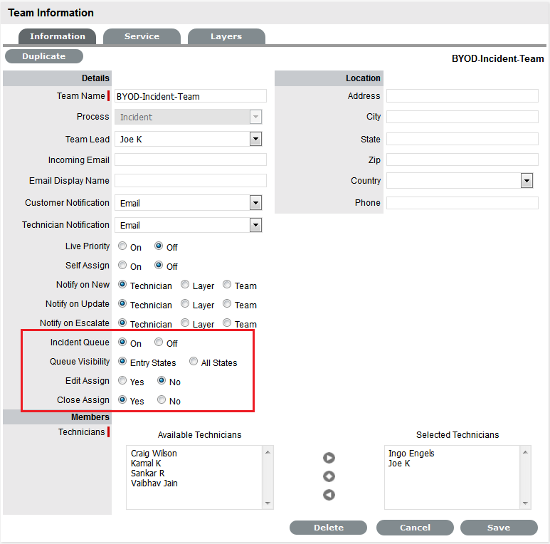 Technician - notifications can be sent to all members within the Team assigned to the request, or restricted to members within the Group to which the request is assigned