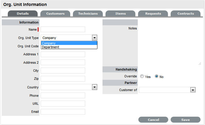 The Organizational Unit, be it a Company or Department with which the Customer is associated. (Organizational Units are created by the Supervisor, in Users >Organizational Units.) |